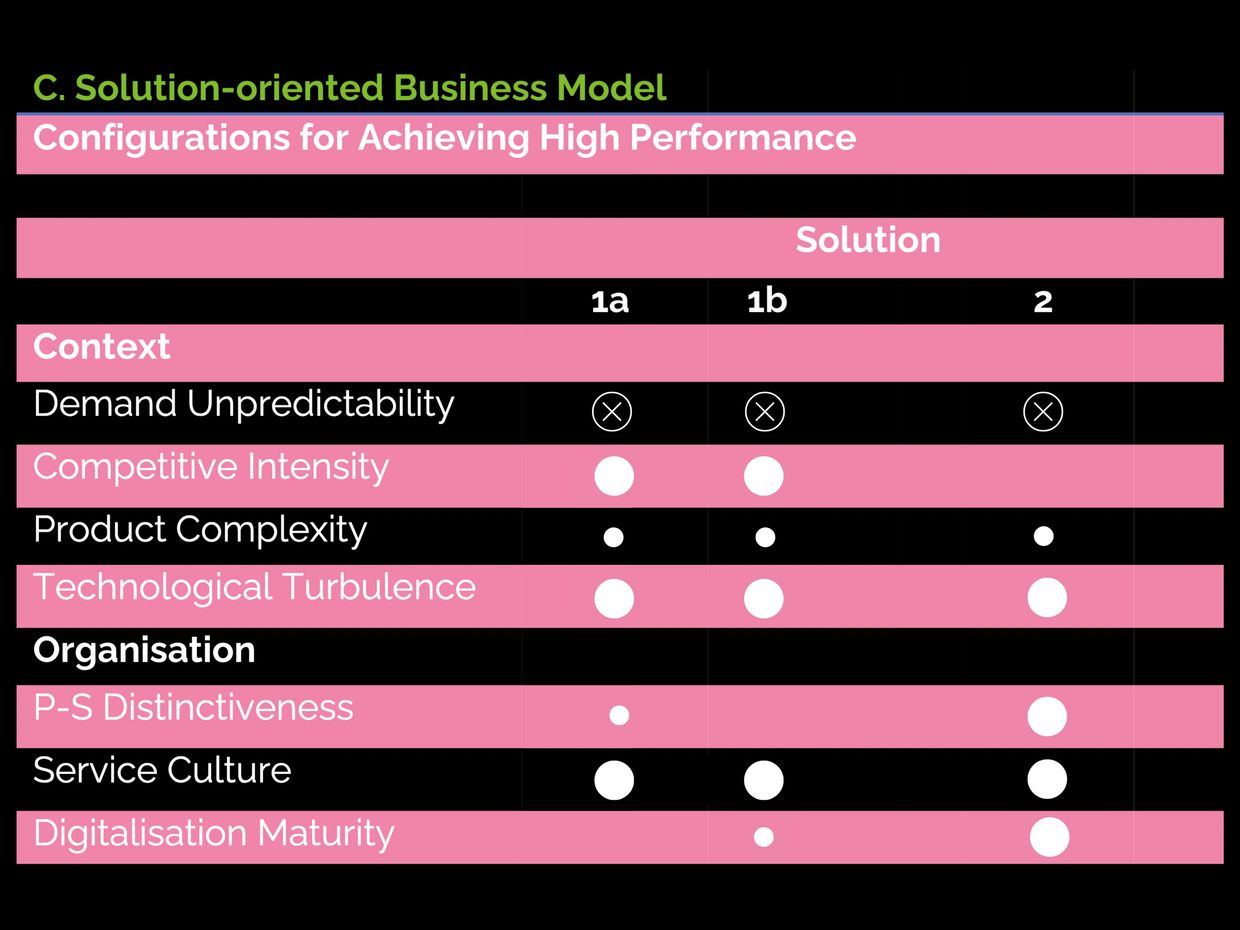 There are two distinct yet closely related configurations that lead to high-performing SMEs adopting a solution-oriented business model. Both configurations align with the context commonly associated with integrated product-service solutions, characterised by complex products and rapidly changing technology within the industry.